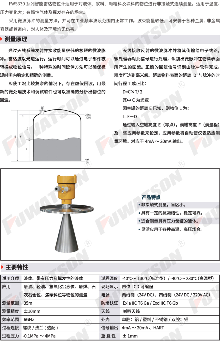 FWS330系列智能(néng)雷達物位計(jì)适用于對液(ye)體、漿料、顆粒(lì)料及塊料的(de)物位進行非(fei)接觸式連續(xù)測量,适用于(yu)溫度、壓力變(bian)化大;有惰性(xing)氣體及揮發(fa)存在的場合(he)。...